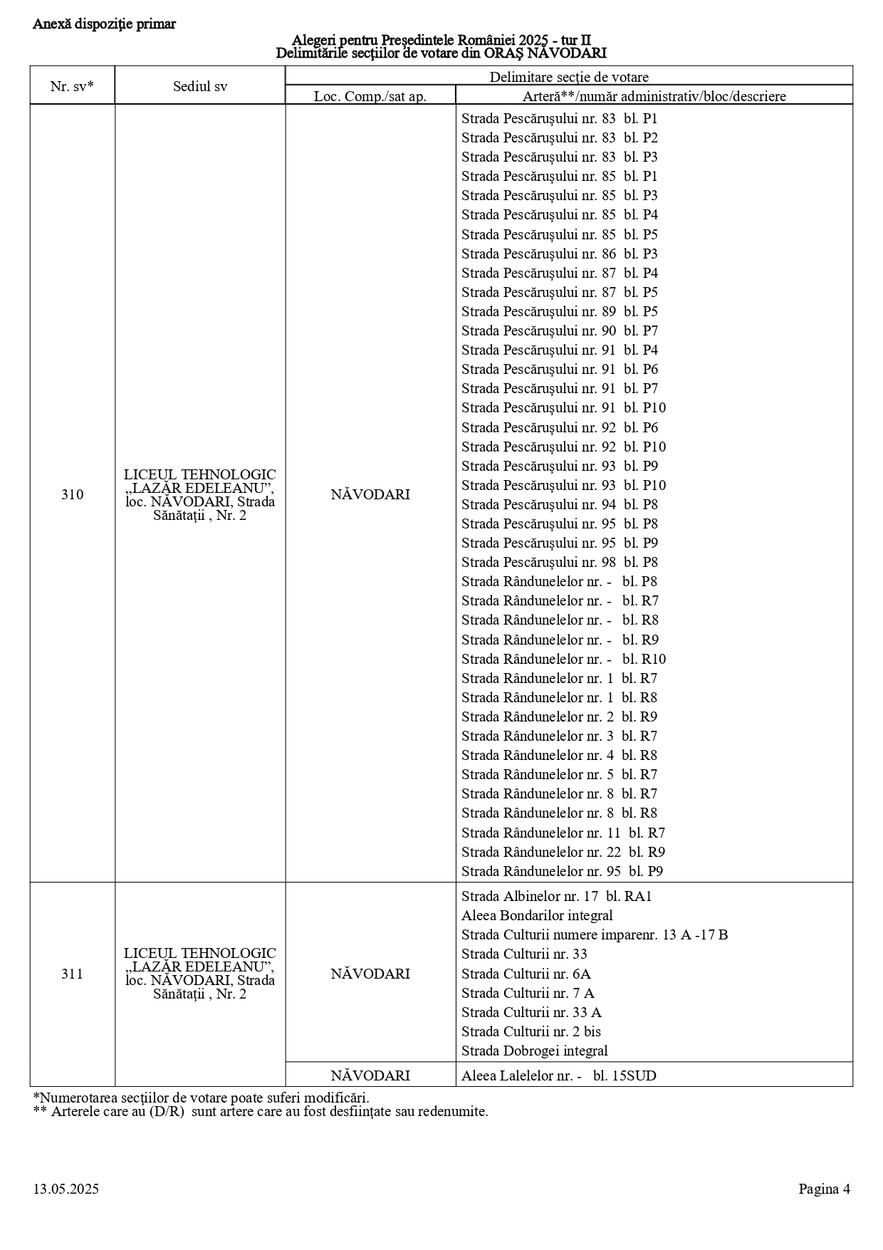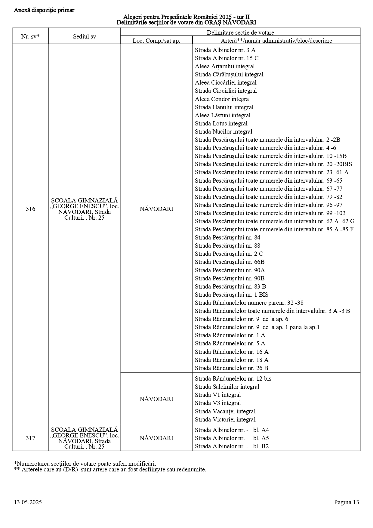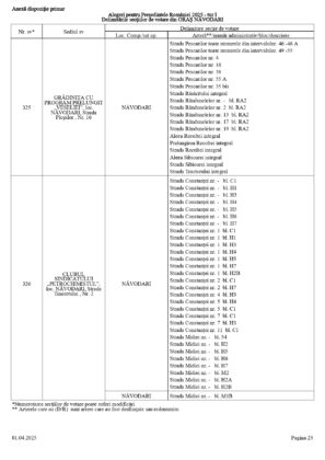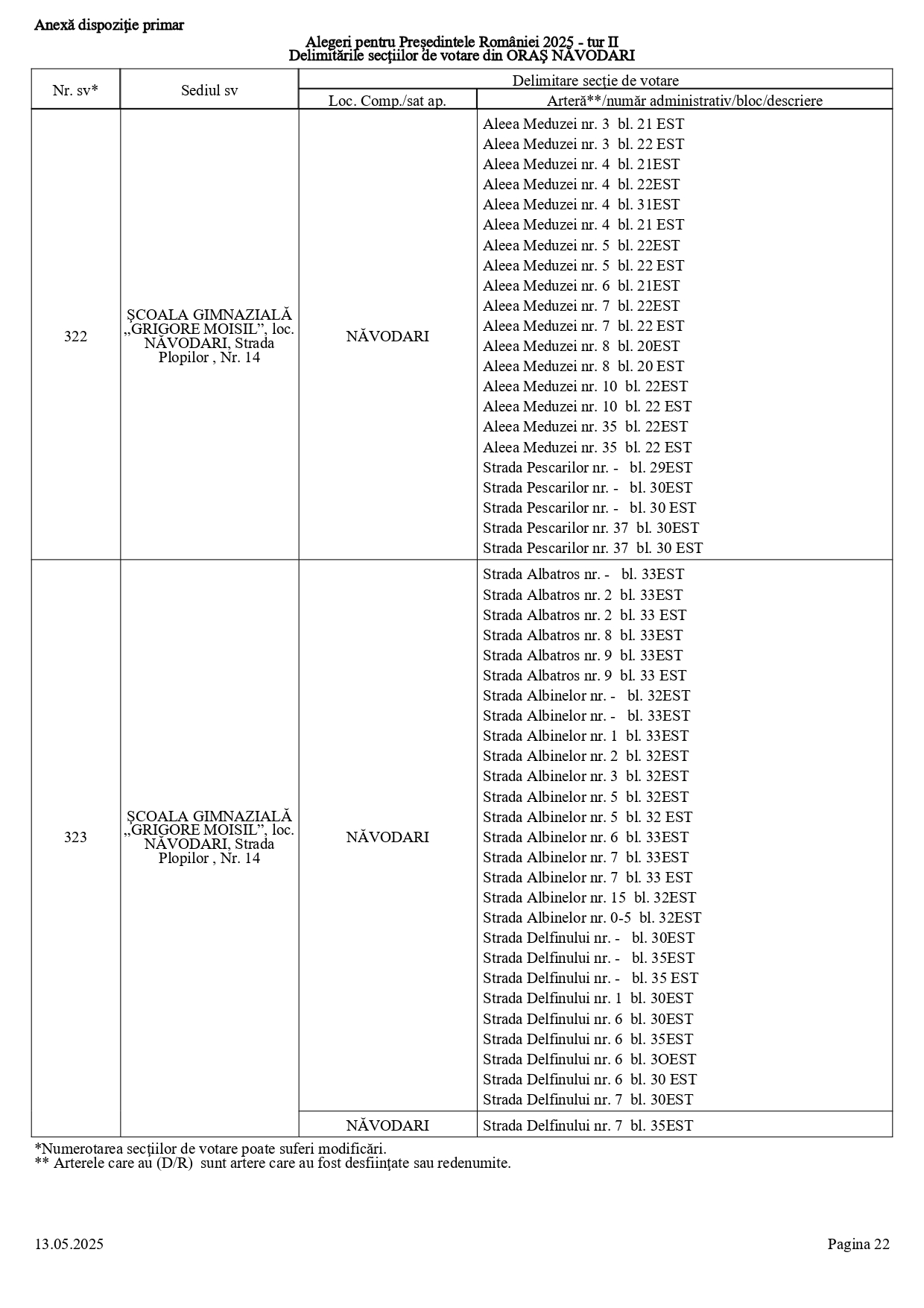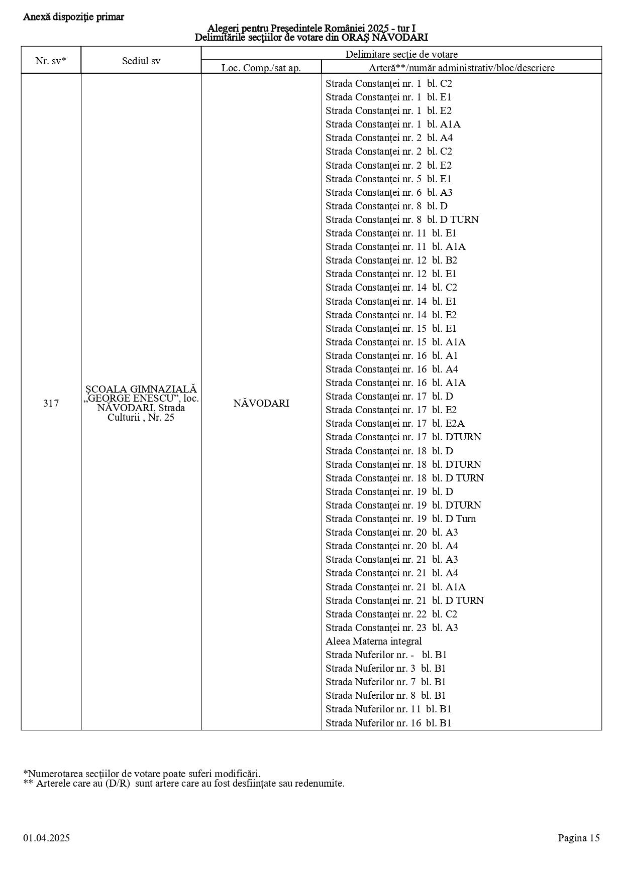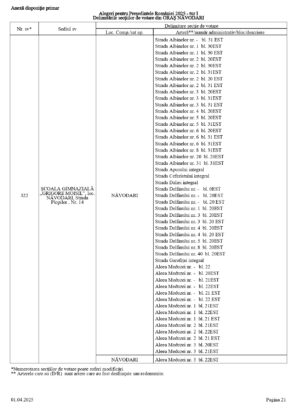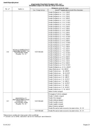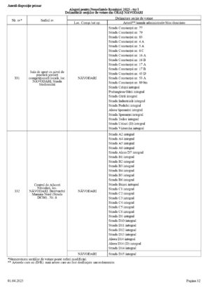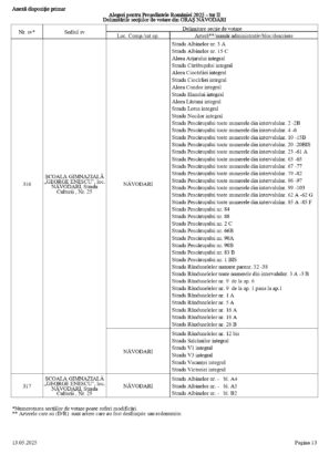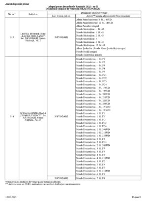 Vă prezentăm, în documentul de mai jos, tabelul conținând informații privind delimitările secțiilor de votare din orașul Năvodari: numărul și sediul secției de votare, cu străzile/arterele aferente (număr administrativ/bloc/descriere).