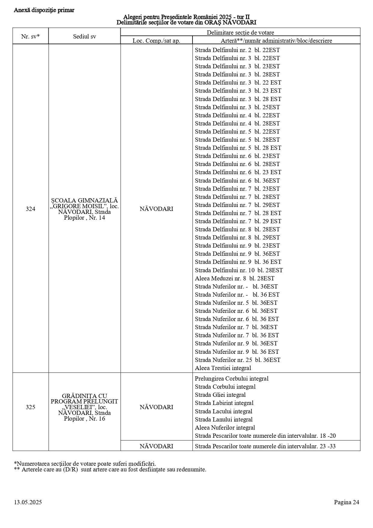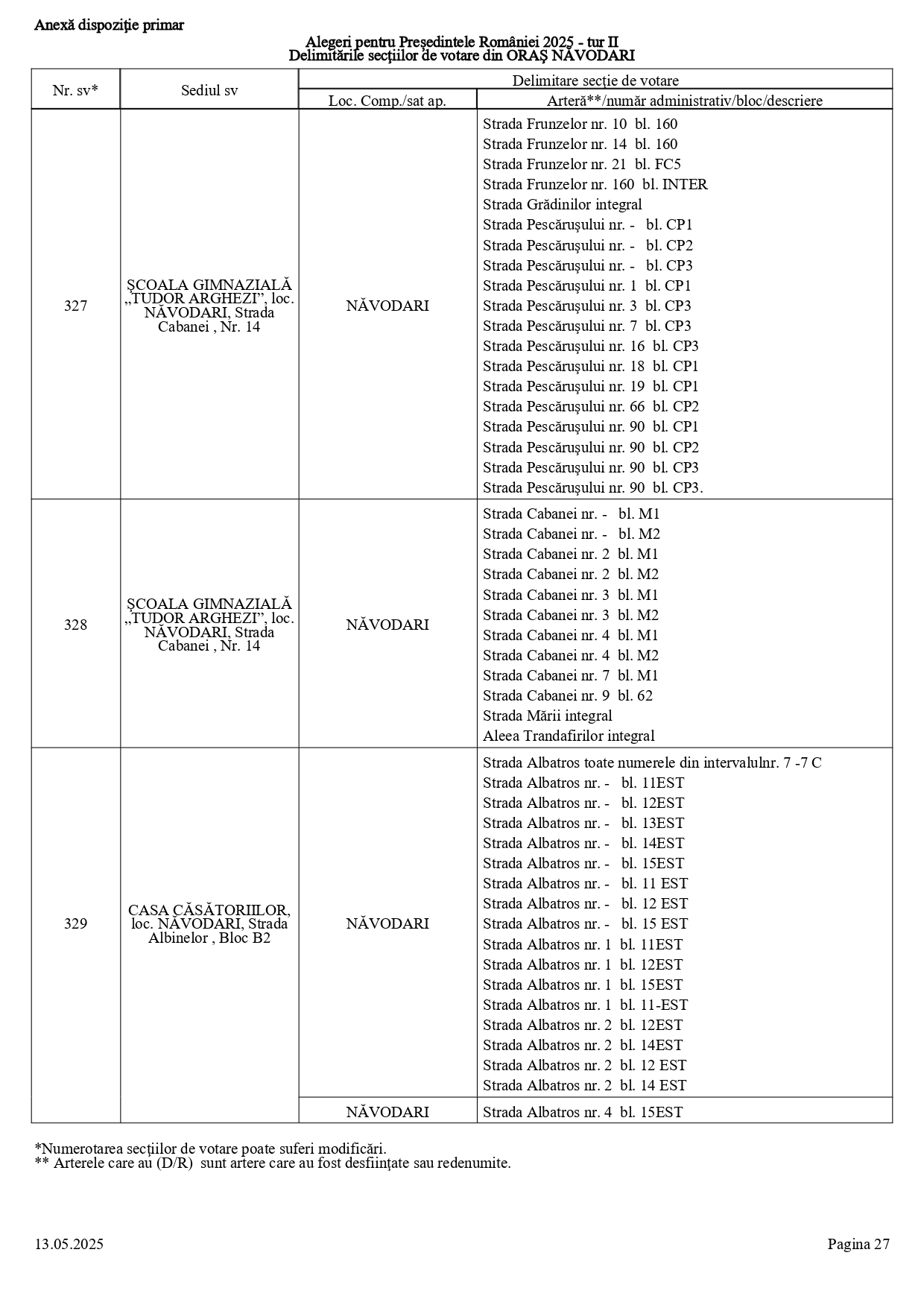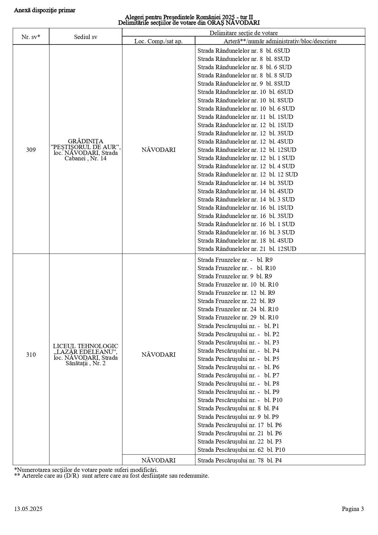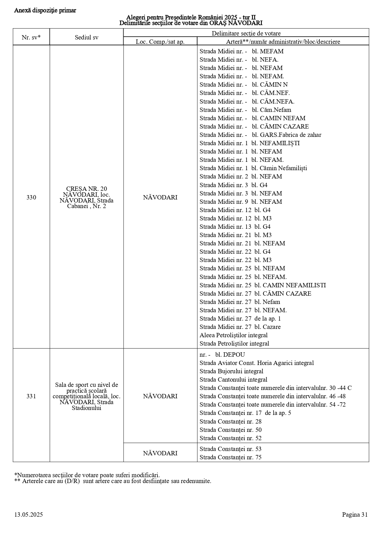 Vă prezentăm, în documentul de mai jos, tabelul conținând informații privind delimitările secțiilor de votare din orașul Năvodari: numărul și sediul secției de votare, cu străzile/arterele aferente (număr administrativ/bloc/descriere).