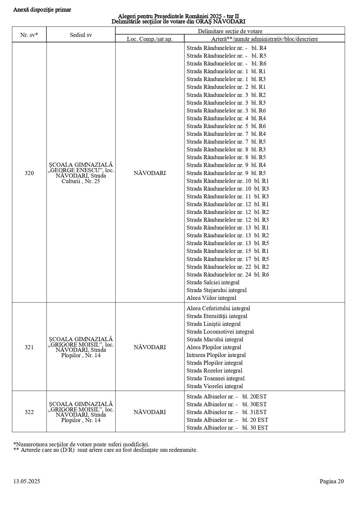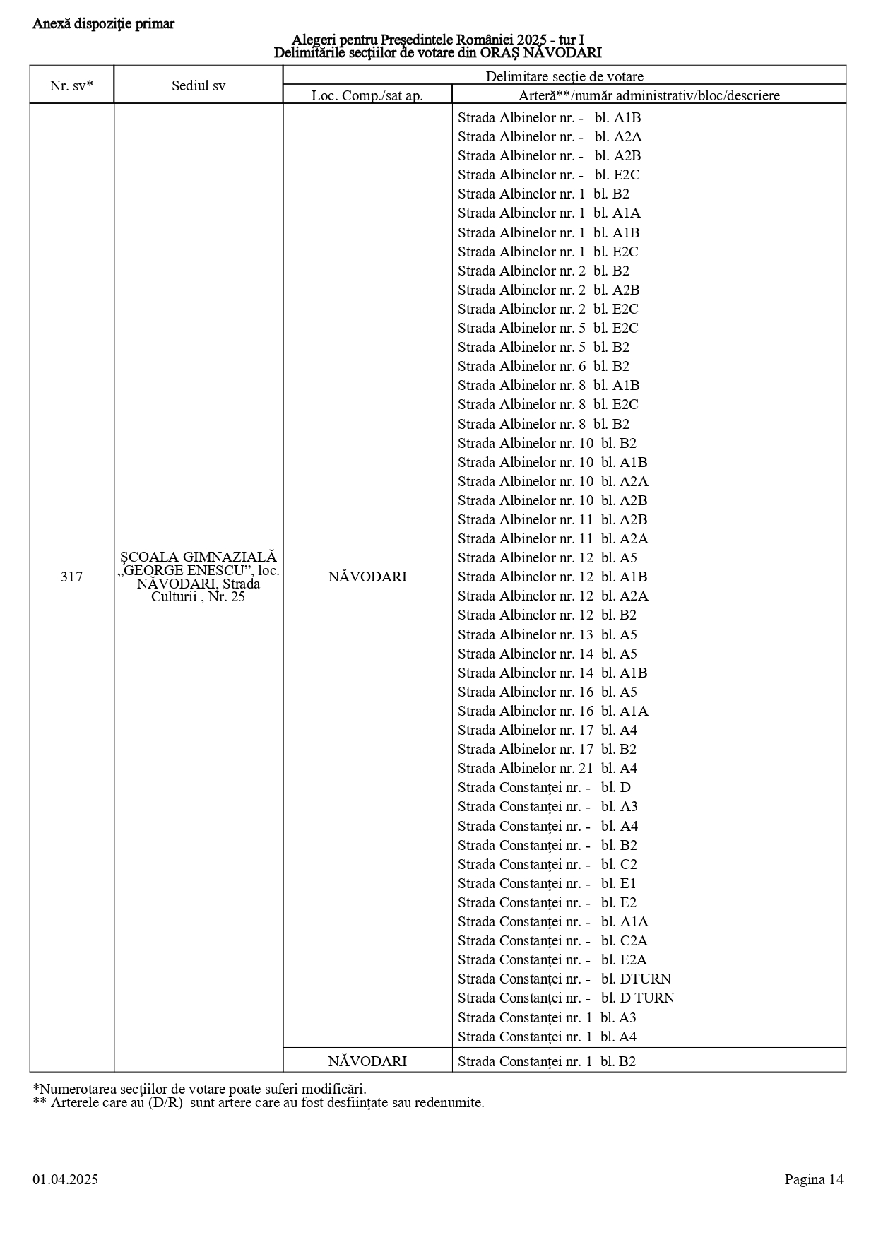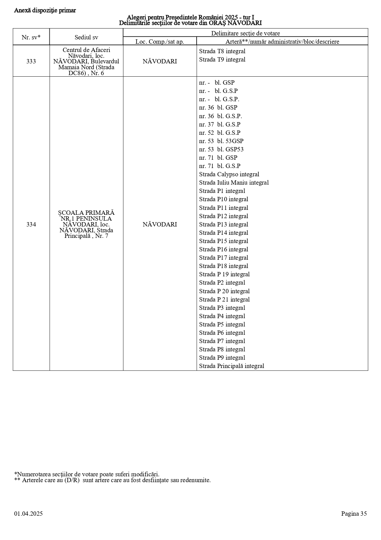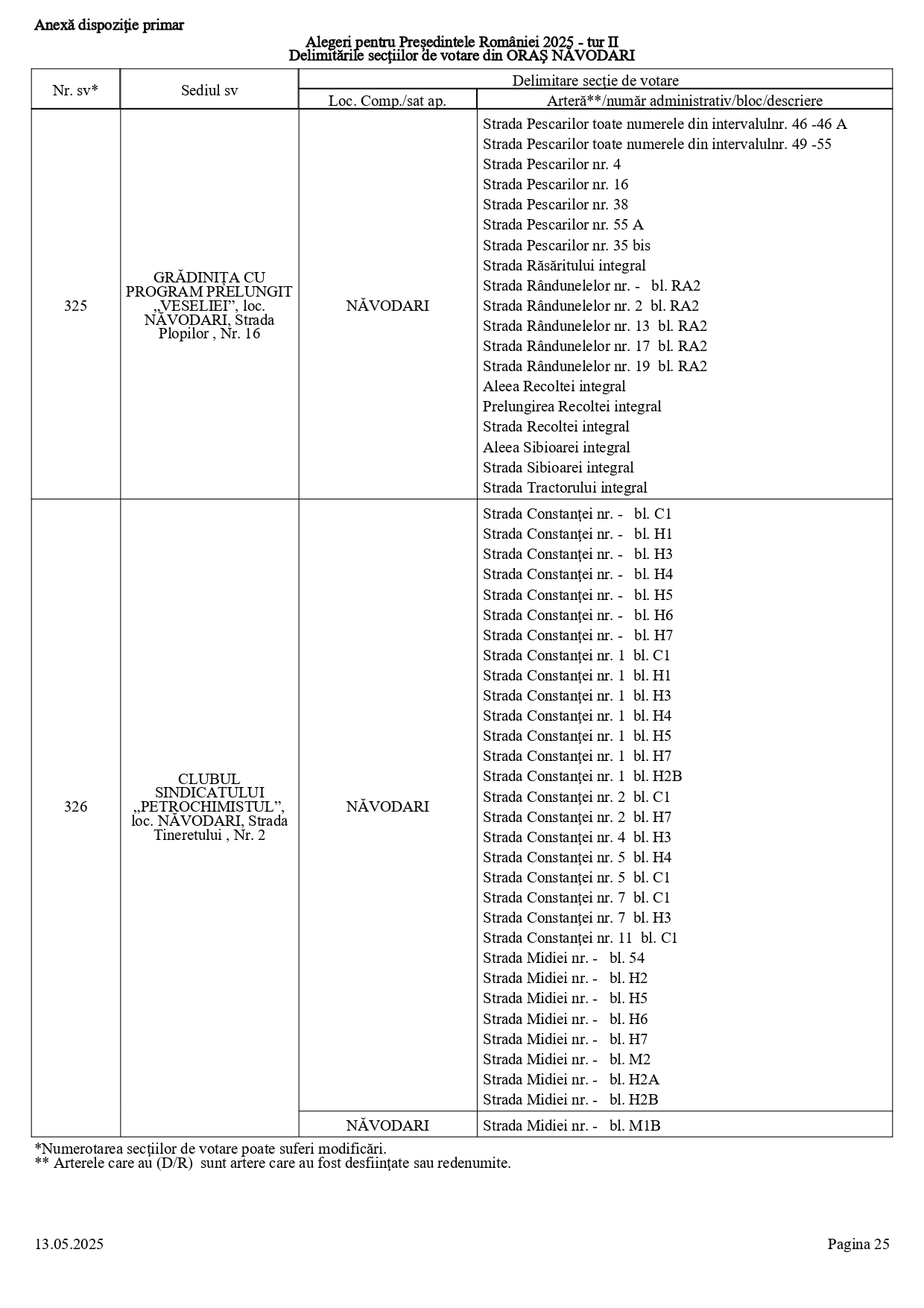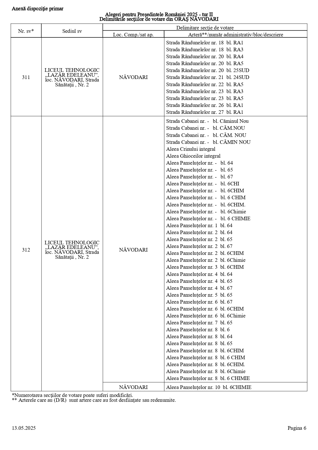 Vă prezentăm, în documentul de mai jos, tabelul conținând informații privind delimitările secțiilor de votare din orașul Năvodari: numărul și sediul secției de votare, cu străzile/arterele aferente (număr administrativ/bloc/descriere).