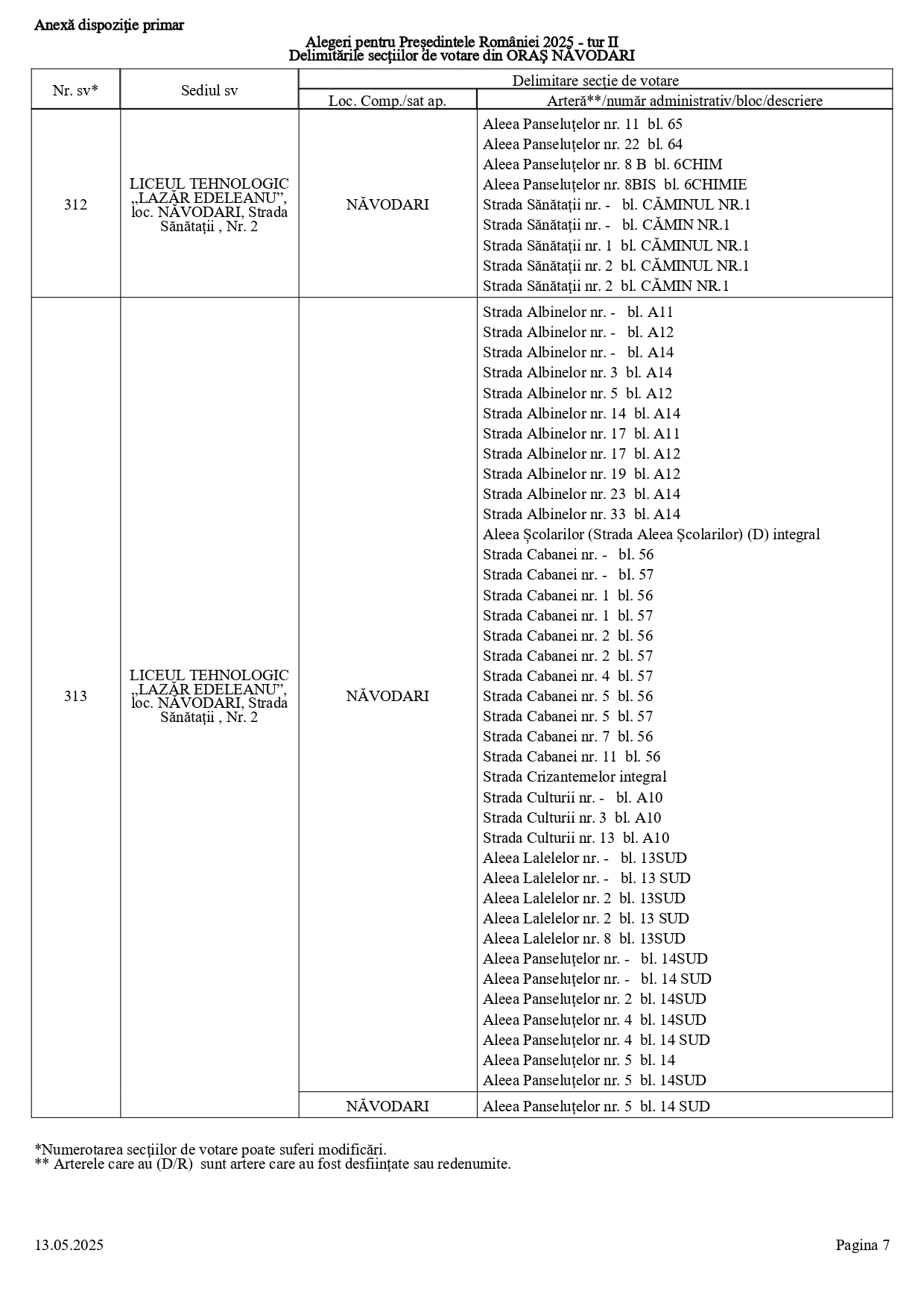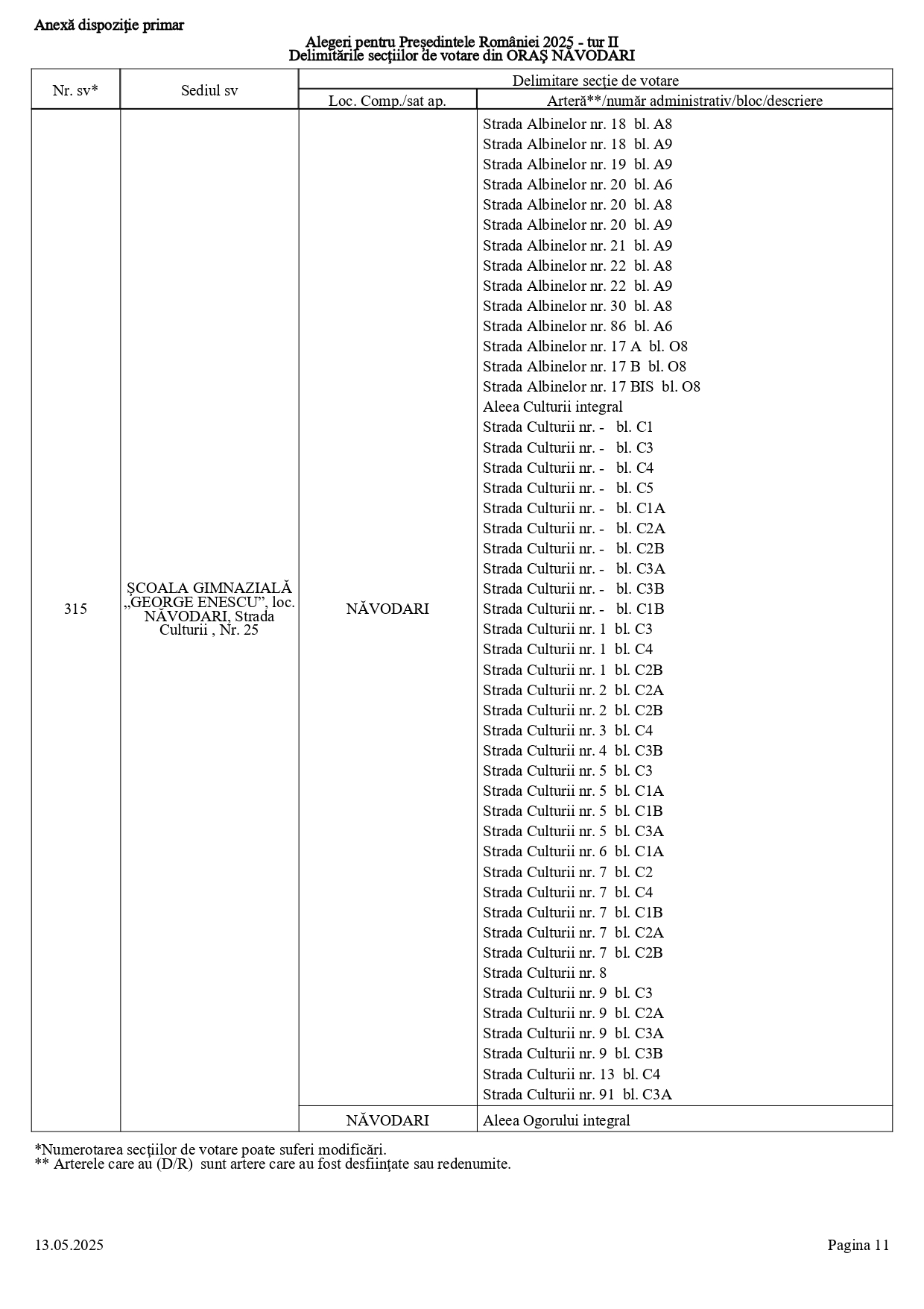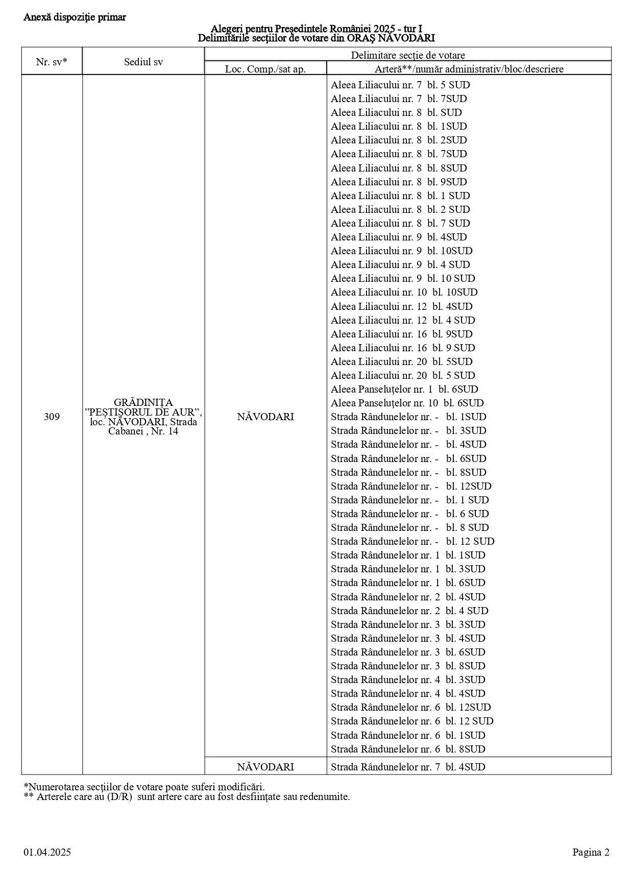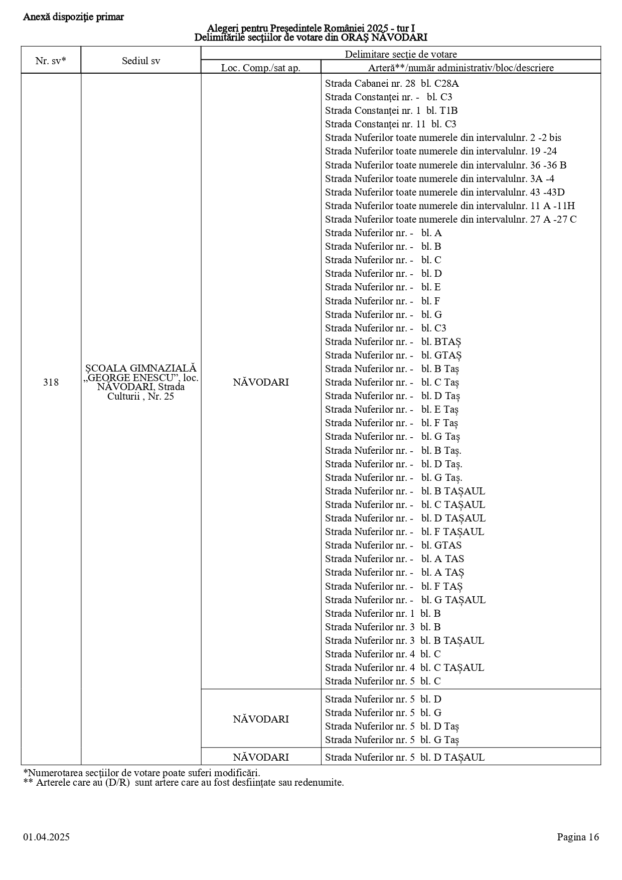 Vă prezentăm, în documentul de mai jos, tabelul conținând informații privind delimitările secțiilor de votare din orașul Năvodari: numărul și sediul secției de votare, cu străzile/arterele aferente (număr administrativ/bloc/descriere).