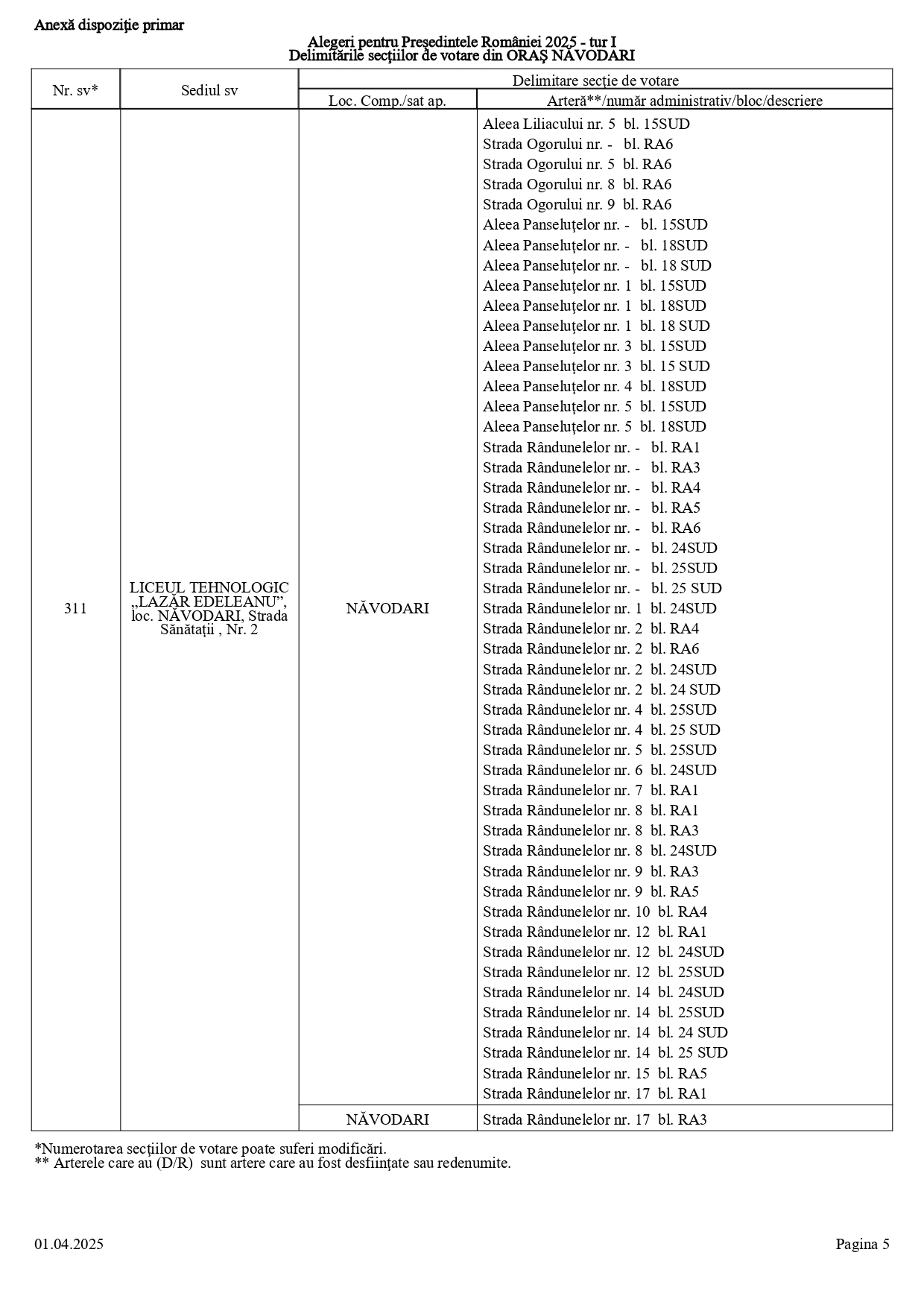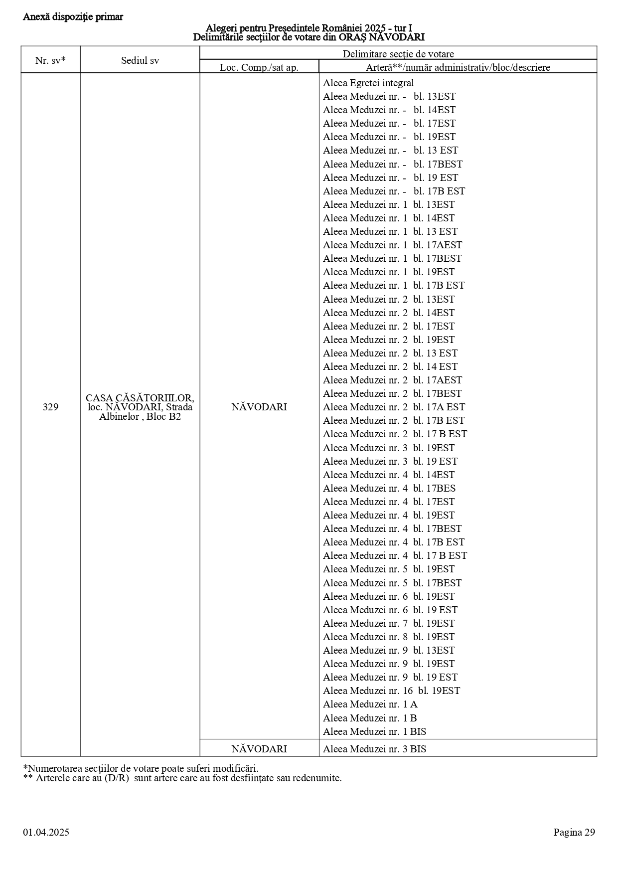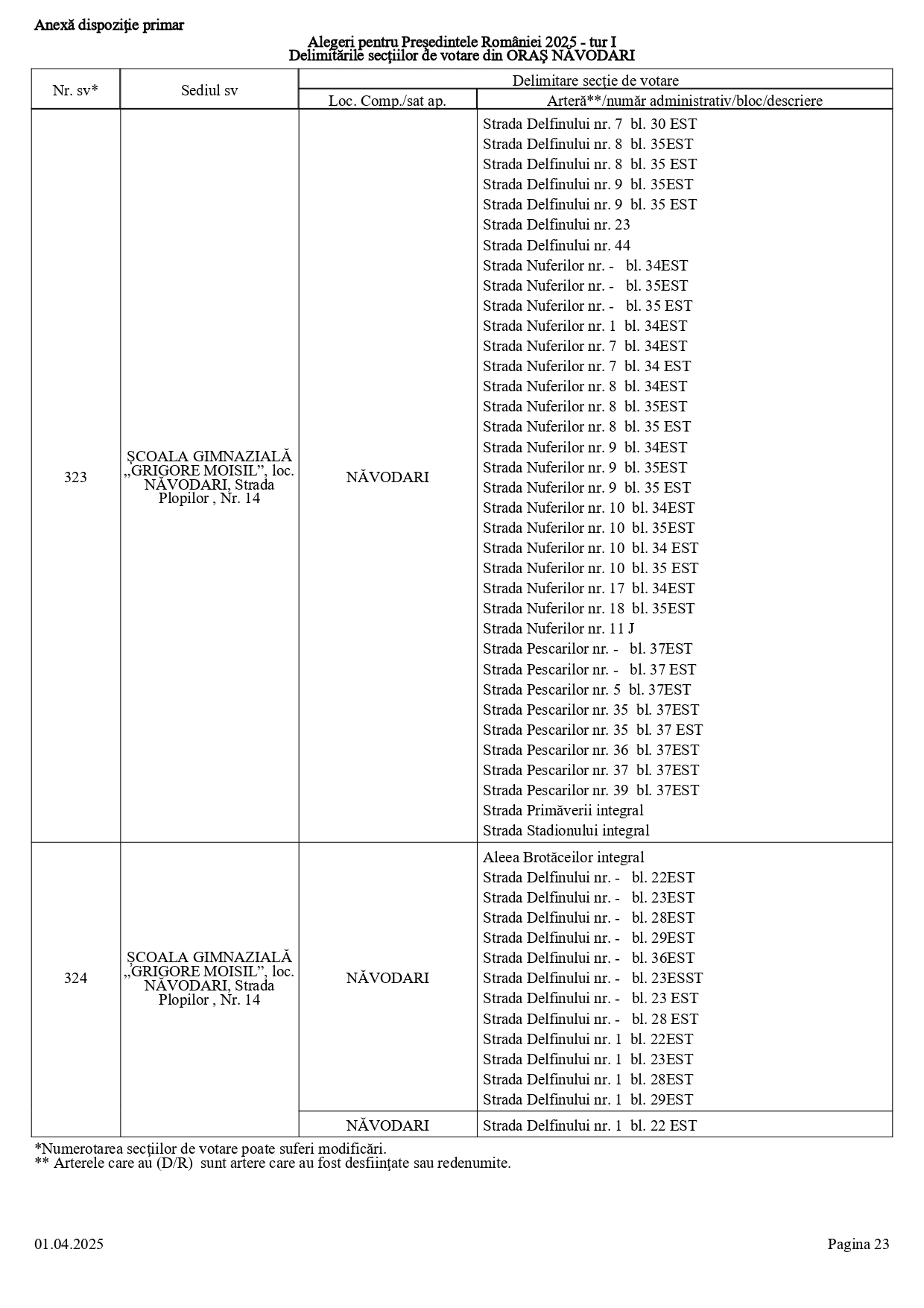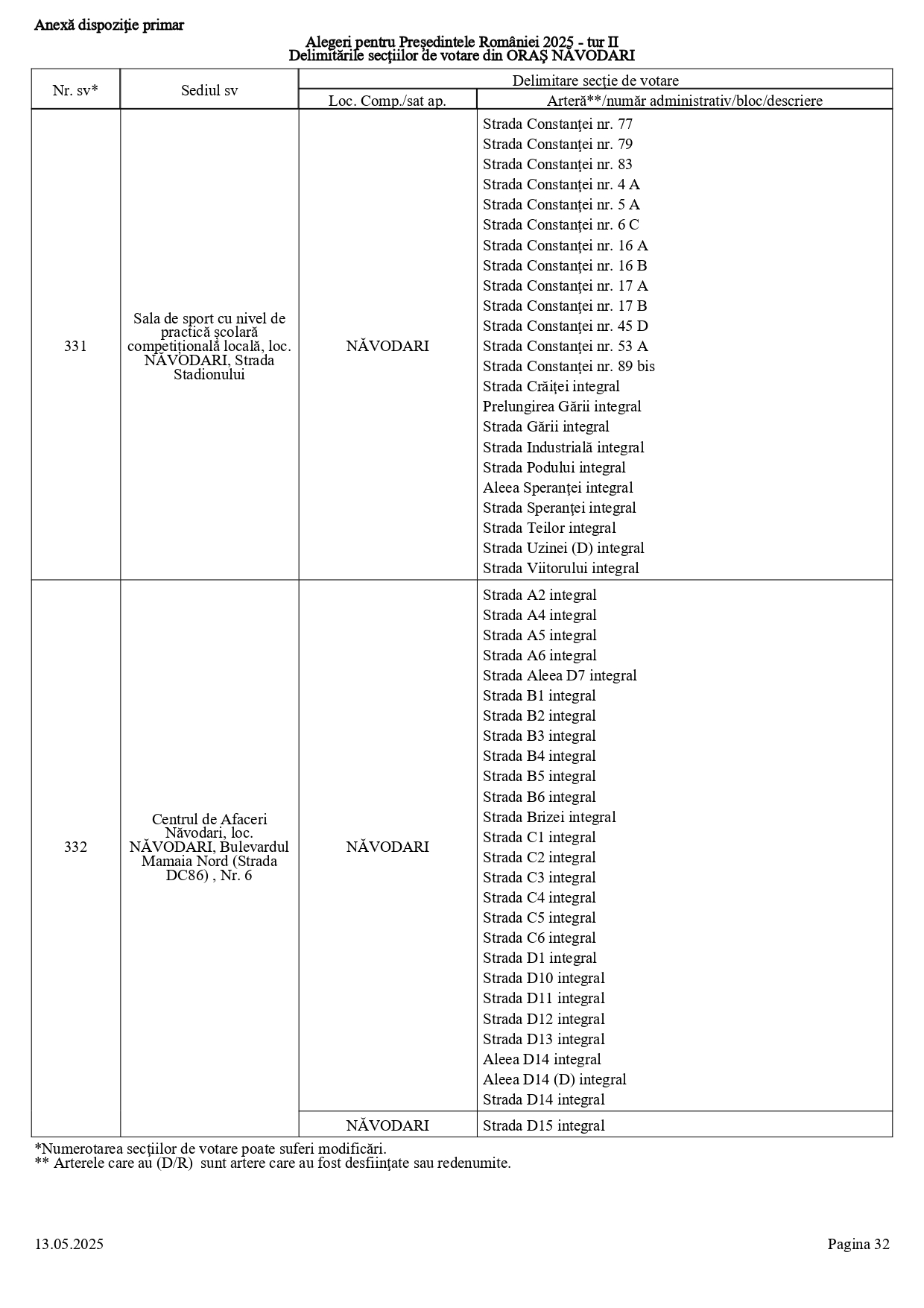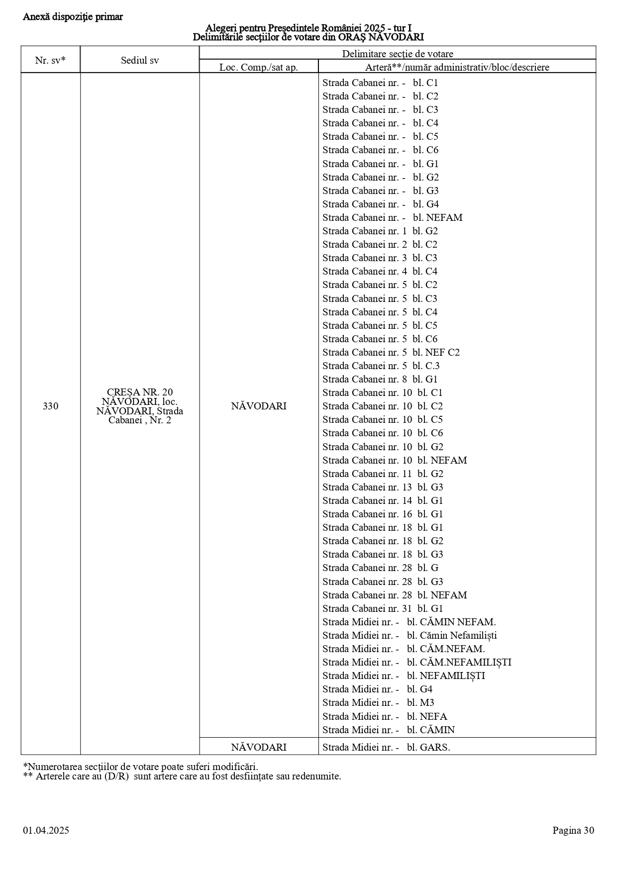 Vă prezentăm, în documentul de mai jos, tabelul conținând informații privind delimitările secțiilor de votare din orașul Năvodari: numărul și sediul secției de votare, cu străzile/arterele aferente (număr administrativ/bloc/descriere).