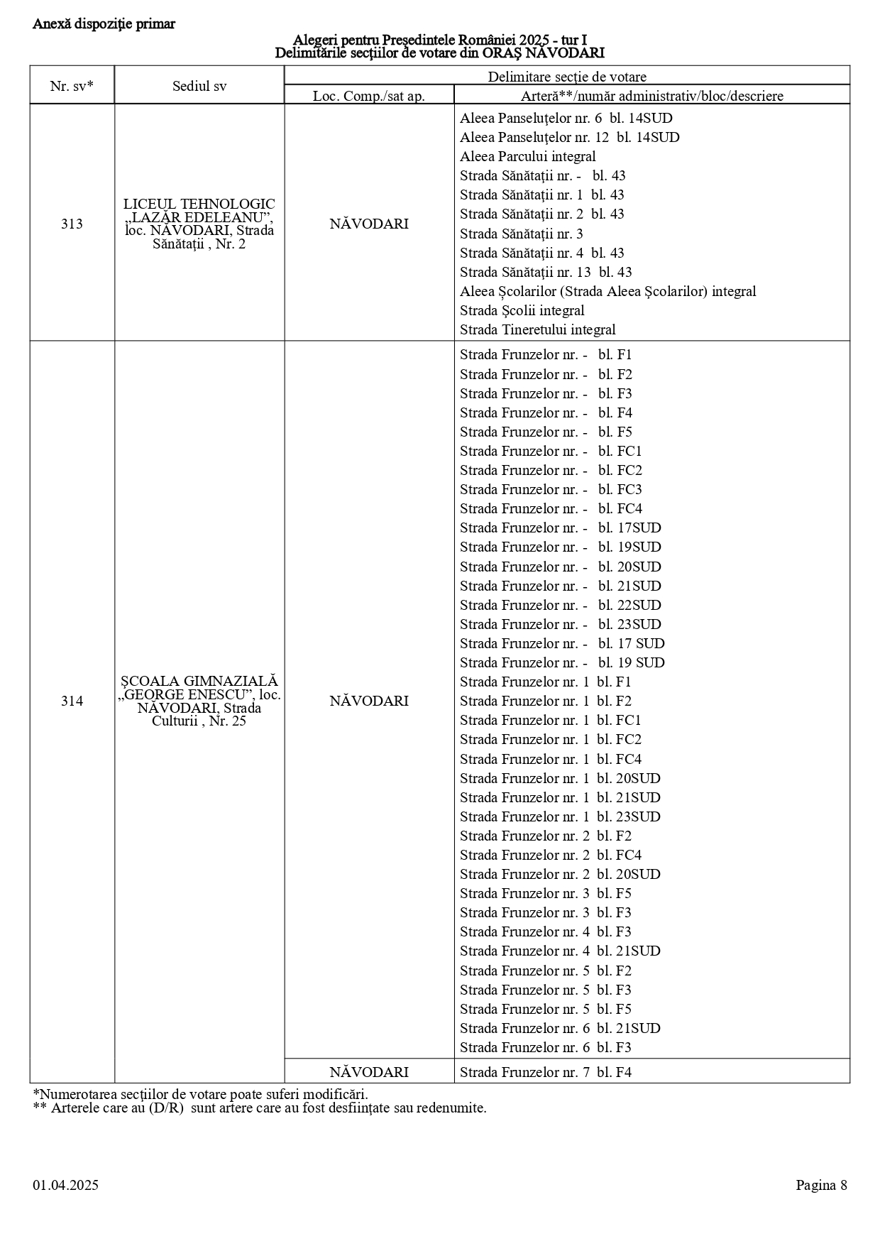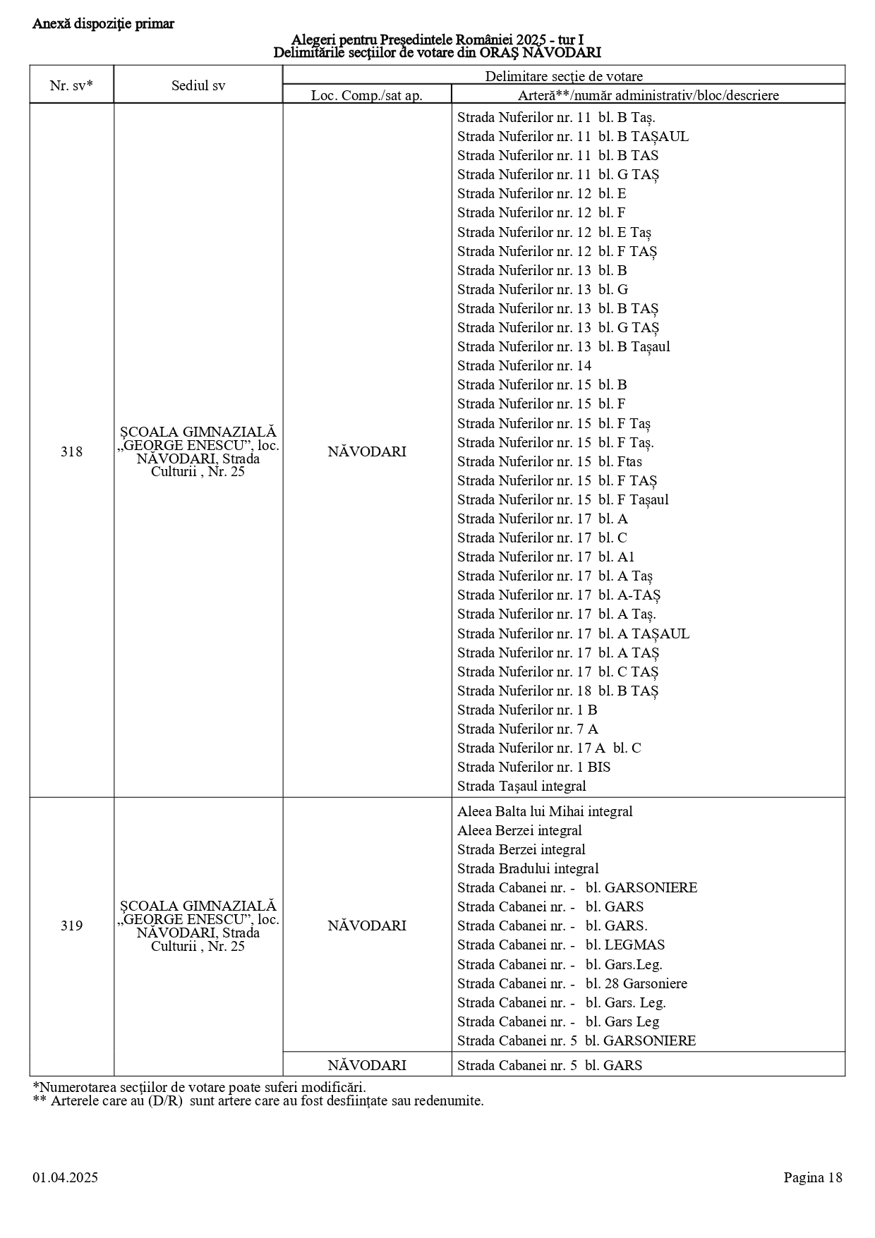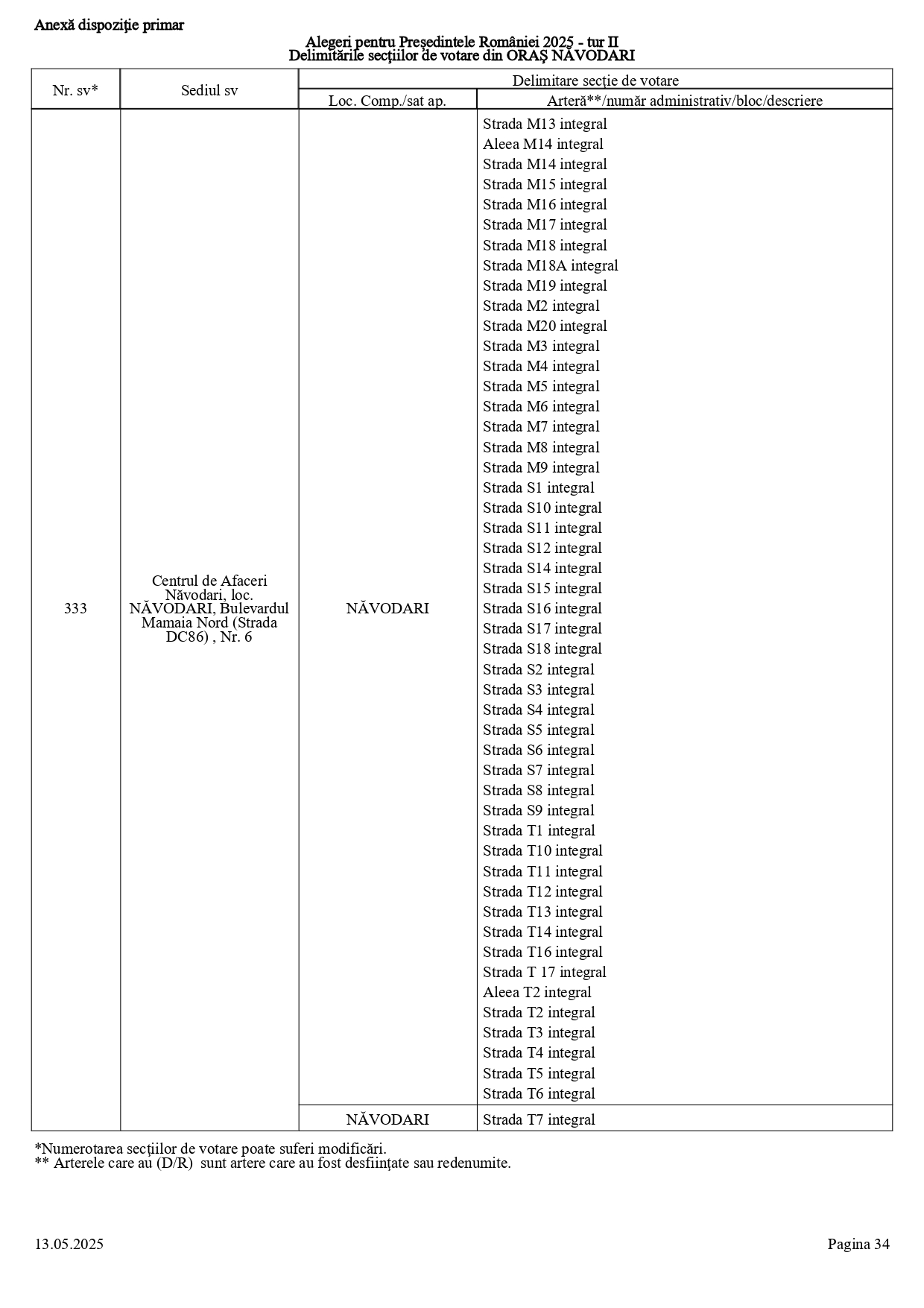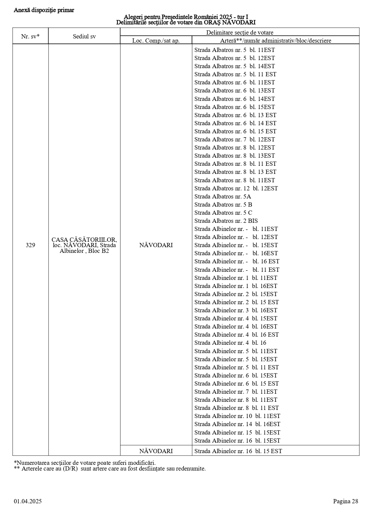 Vă prezentăm, în documentul de mai jos, tabelul conținând informații privind delimitările secțiilor de votare din orașul Năvodari: numărul și sediul secției de votare, cu străzile/arterele aferente (număr administrativ/bloc/descriere).