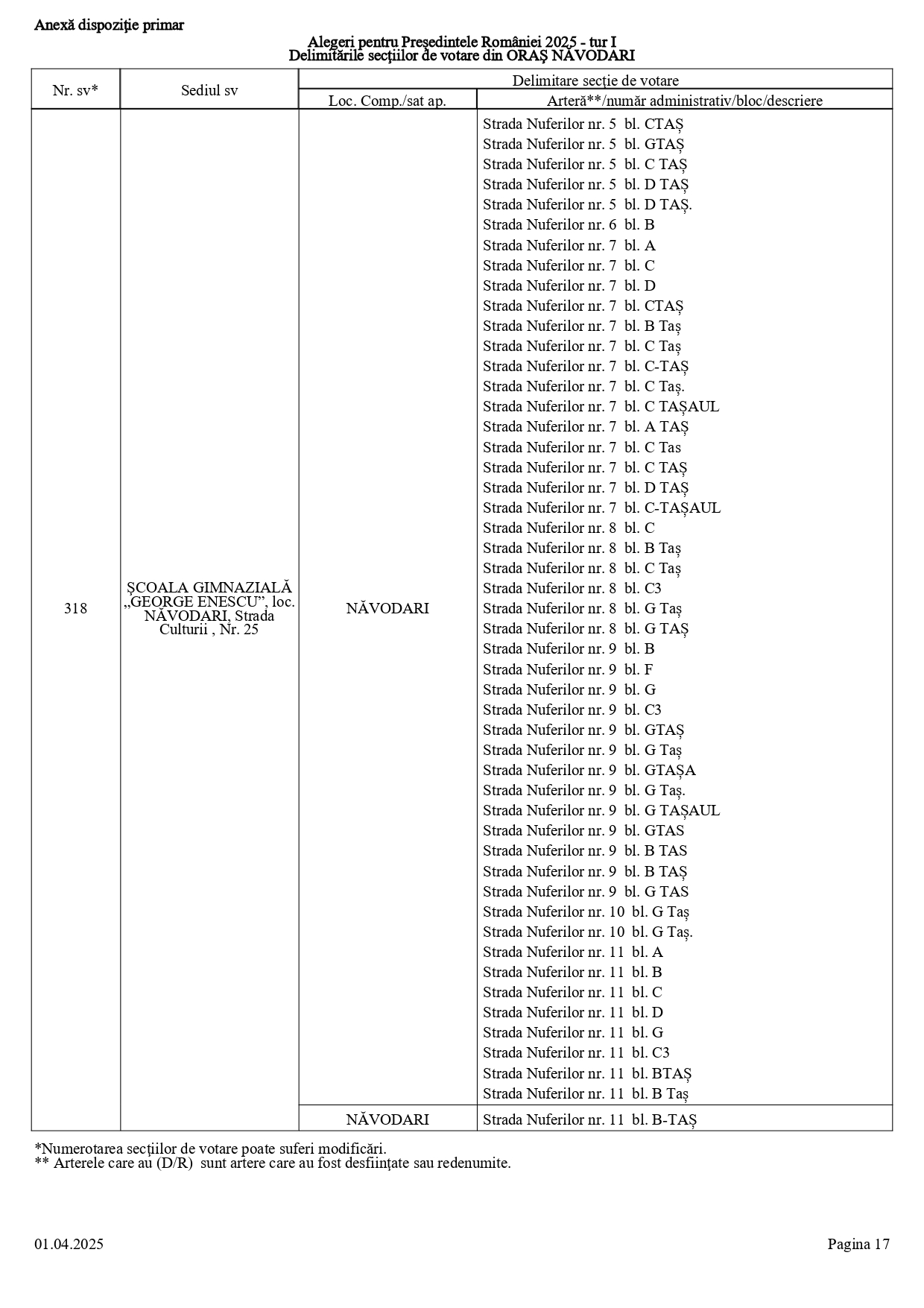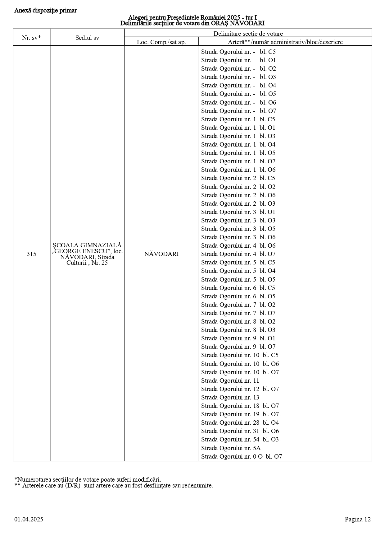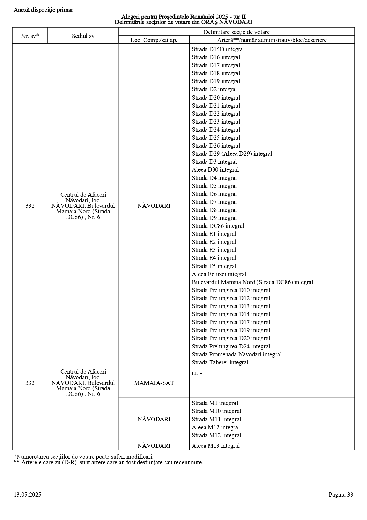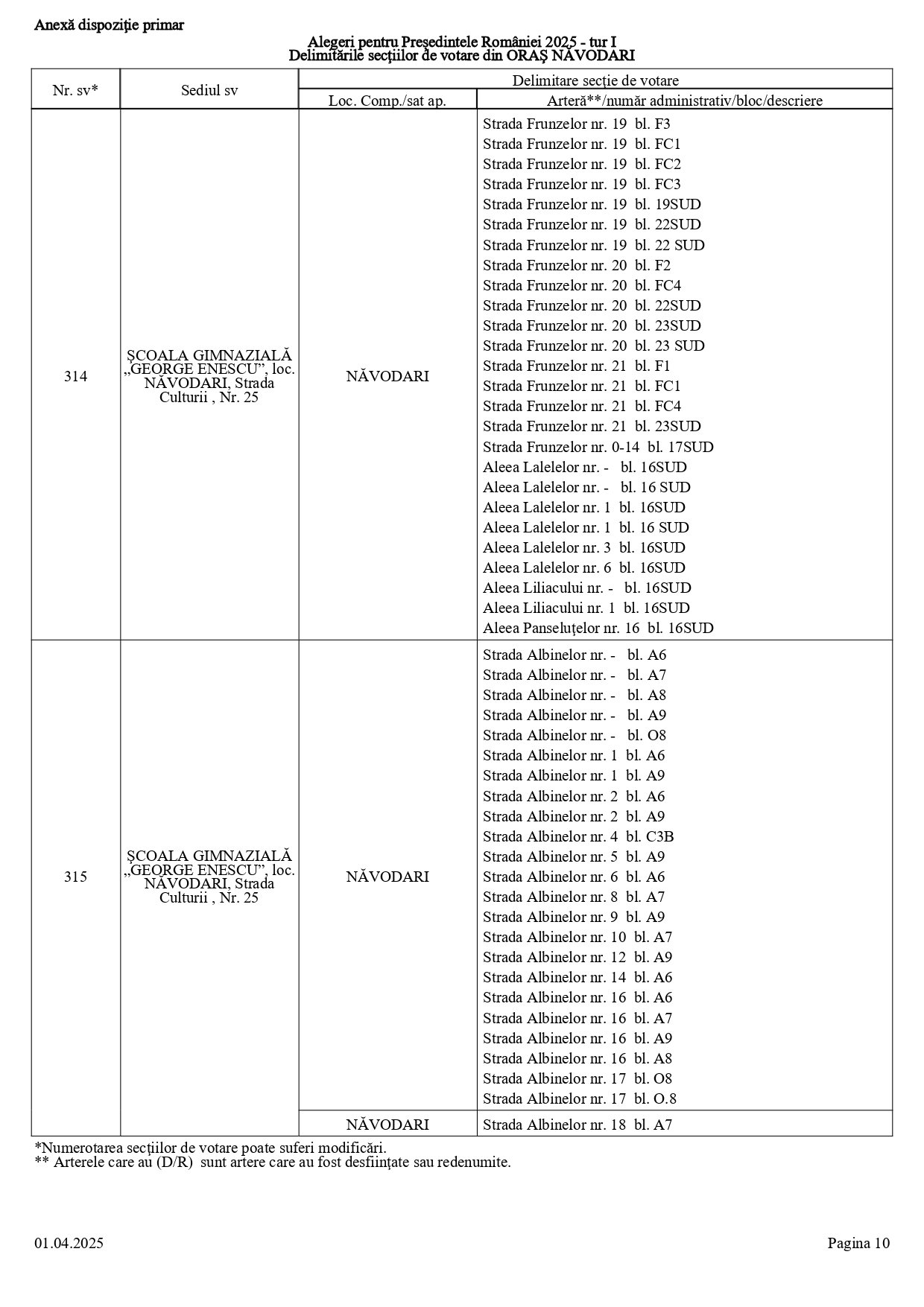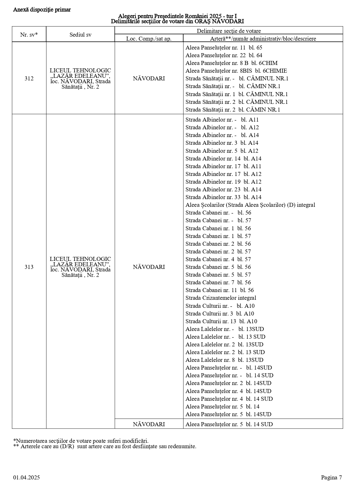 Vă prezentăm, în documentul de mai jos, tabelul conținând informații privind delimitările secțiilor de votare din orașul Năvodari: numărul și sediul secției de votare, cu străzile/arterele aferente (număr administrativ/bloc/descriere).